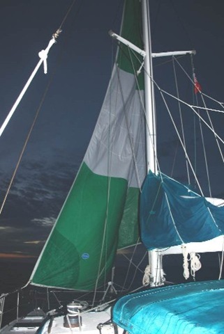 Dallas and I split the night watch into two shifts. He took the first shift through the hazard-ridden area. Naturally, just after he maneuvered us through the “hole in the wall” (a narrow passage between two large rock formations a mile or so off the coast) and just before I came on at 2:00 a.m., the light winds died altogether. After an hour of wasted effort to get the spinnaker to fill, albeit under beautiful, moonlit conditions, I took the liberty of firing up an engine. Normally this wouldn’t be a big deal, but at this point, both engines malfunction on a semi-regular basis. I think we’ve mentioned that the port engine is hard to start for some as yet unknown and potentially serious reason, while the starboard one seems to have a minor electrical problem. The bright side is that once started, both of them work well.