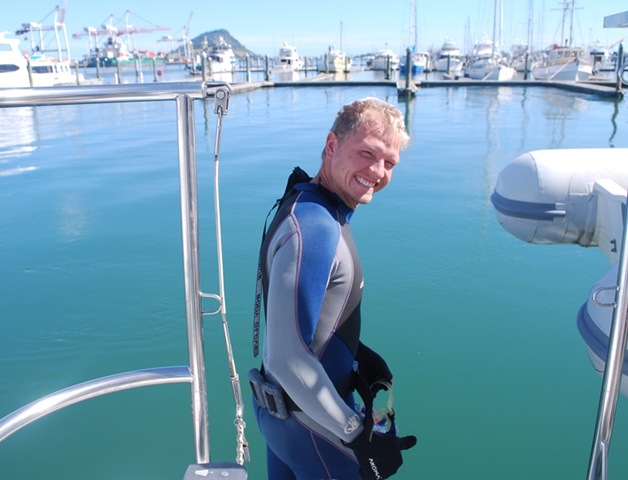 We also had a mechanic stop by the boat to have a quick look at the port engine. Hopefully he’ll be able to make sure things are in order while the boat is at the yard and we’re out visiting the south island. There are basically three problems we’re working on. The first is that the low oil pressure alarm has been going off since the Galapagos. I assumed it was the oil pressure regulator because we’d just had to replace it in Panama, but it may be the sensor. So far, after going off consistently all across the Pacific, it has refused to act up with an oil pressure gauge on it here in New Zealand. I bought one and have it installed now, so we can see exactly what’s going on next time the alarm goes off. The second problem is that the engine seemed to get hard to start and lose power (0.5-1.0 knots slower than the starboard engine at 2400 rpms) at about the same time on the way down from Tonga. That seemed a bit odd as it was just rebuilt before leaving Florida, but luckily the mechanic didn’t think it is a compression issue. We’ll take a look at the fuel pump/injection system to make sure things are OK there. While we were troubleshooting the oil pressure problem in Opua, we noticed that the transmission was having a little trouble going into gear. It sounds like that’s going to require taking the transmission apart to have a look, but at least the timing is good — we’re near a mechanic and not planning to do any travelling with the boat for a couple of months. It seem like we’re on track to have all of our major repairs completed by the end of January, which would be nice. The last project before leaving for Raglan was to put a new zinc on the starboard prop shaft. When we were out troubleshooting the port engine a few days ago I noticed it had gone missing. A cold dip in the murky marina water wasn’t high on my list of fun things to do in the morning, but I didn’t have any intimate jellyfish encounters and it’s done.